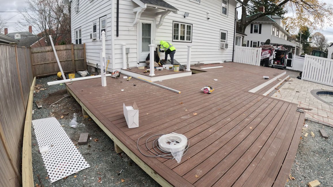 At The Pros, Inc., our Patio & Deck Building Projects in Massachusetts showcase expertly crafted outdoor living spaces designed for durability, comfort, and long-lasting visual appeal. We specialize in custom wood decks, composite decking (Trex & TimberTech), multi-level decks, pool decks, pergolas, railings, stairs, and covered deck structures, along with paver patios, stone patios, stamped concrete patios, and custom outdoor seating areas. Every project completed by The Pros, Inc. is built using premium materials engineered for the New England climate and tailored to enhance property value and outdoor functionality.